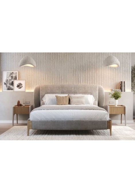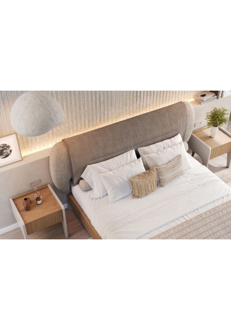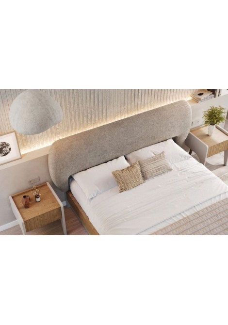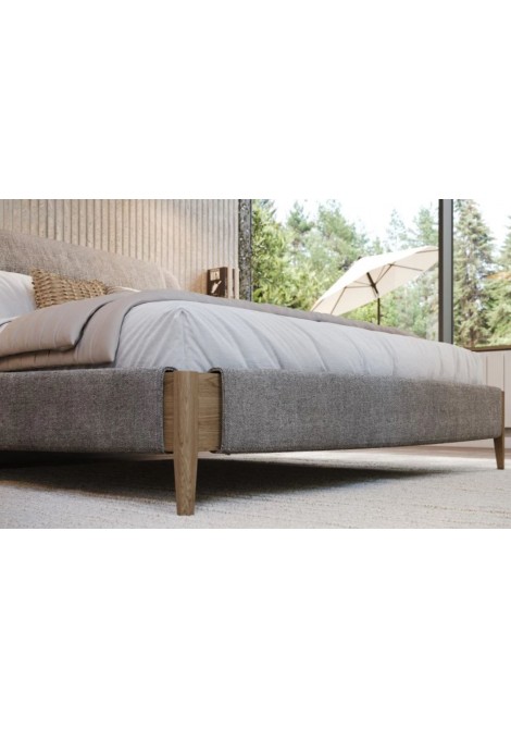 Κρεβάτι από ξύλο δρυς Roxie με δυνατότητα προσθήκης μαξιλαριού, υφασμάτινο κεφαλάρι και ύφασμα στη βάση του κρεβατιού.